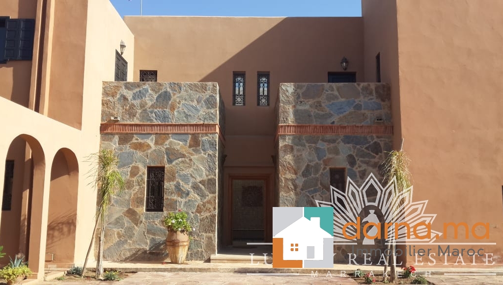 Villa route du barrage, 1 hectare de jardin, 550m² de superficie construite, style riad moderne, 5 chambres à coucher dont une suite parentale à l’étage, vue imprenable sur l’atlas.