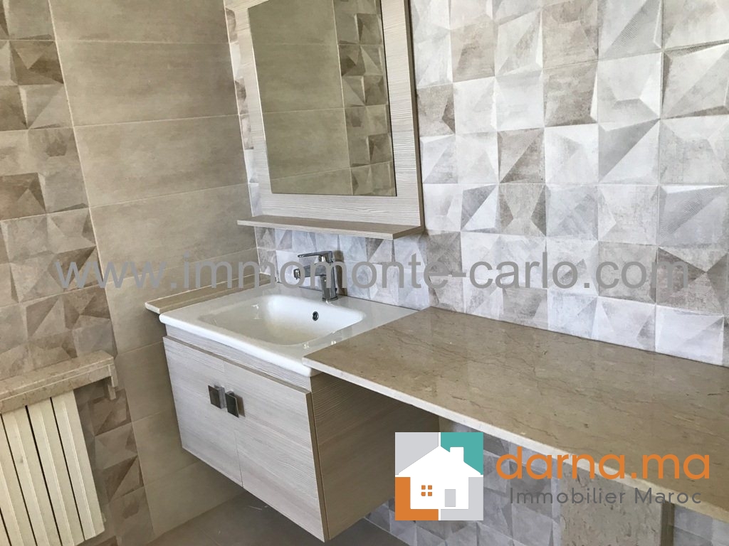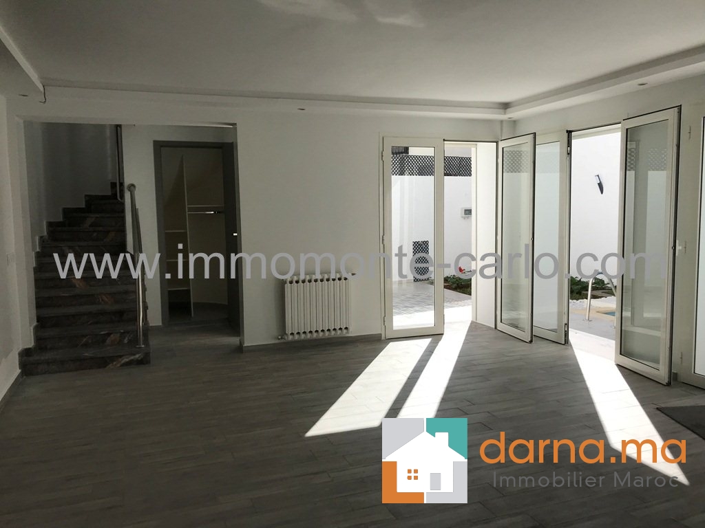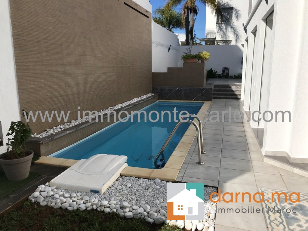 Location Rabat villa de très haute standing neuve moderne avec piscine, très bien située et bien sécurisée, avec chauffage central , climatisation, composée de double salons cheminée donnant sur la piscine et belle cascade, salle d’eau des invités, 4 chambres à coucher avec 3 salles de bain dont une suite parentale avec vue panoramique sur le Bouregreg et l'océan avec terrasse dressing et salle de bain, cuisine moderne bien équipé, buanderie, un grand garage, logement de personnel …Pour plus d’informations ou visite n’hésitez pas de contacter notre agence immobilière Immo Monte-Carlo au N° de tél: +212 (0)6 61 46 40 37 /+212 (0)6 61 21 25 47 ou Tél/Fax:+212 (0) 537 755 043 ou par E-mail : Cette adresse e-mail est protégée contre les robots spammeurs. Vous devez activer le JavaScript pour la visualiser. ou rendez-vous au 15.Av, Al Abtal N°4, Agdal RABAT MAROC.